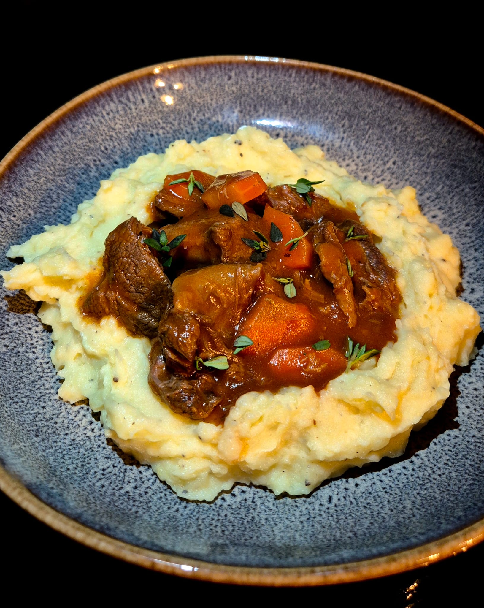Schep een mooie bol romige aardappelpuree op het bord en lepel daar een royale portie hertenstoof overheen. Garneer met wat verse tijm.